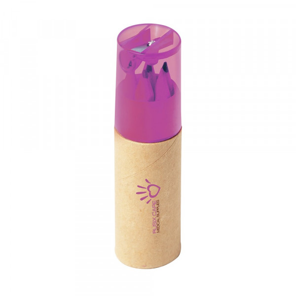 6 Buntstifte in einem Pappköcher mit einem Anspitzer im Kunststoffdeckel. mehr