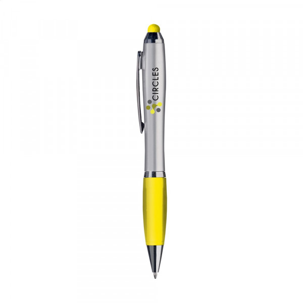 Blauschreibender Kugelschreiber mit farbiger, gummierter Spitze/Pointer zum Bedienen von Touchscreens (wie iPhone/iPad), hochglänzenden Akzenten, farbigem, grifffestem Vorderteil, Aussparungen im Metallclip und Dreh-Klicksystem.