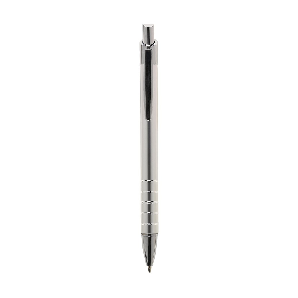 Blauschreibender Aluminiumkugelschreiber in Metallic-Look, mit Metallclip und Zwischenringen.
