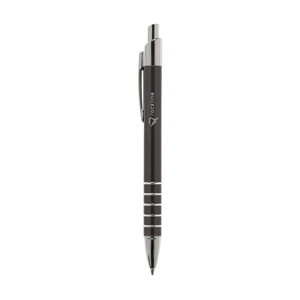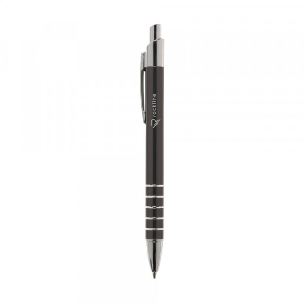 Blauschreibender Aluminiumkugelschreiber in Metallic-Look, mit Metallclip und Zwischenringen. mehr