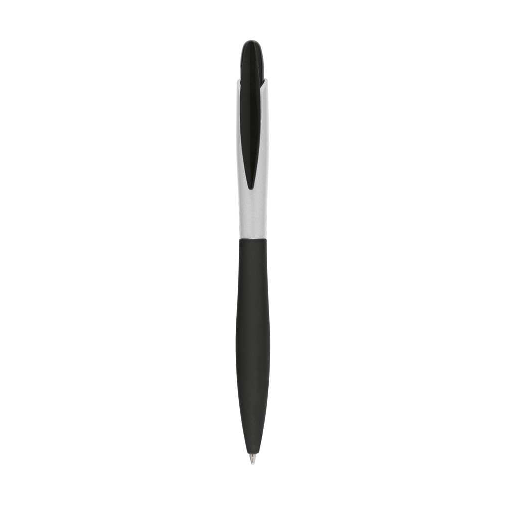Blauschreibender, schlanker Kugelschreiber mit grifffestem, gummiertem Vorderteil. mehr