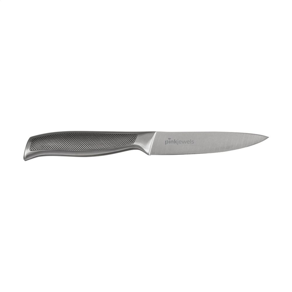 Universal-Küchenmesser aus der Riyouri-Serie von Diamant Sabatier. Mit 11 cm langer spitzer Klinge. Zum Schneiden von verschiedenen Gemüsesorten, Käse und zum Schnippeln von Zwiebeln. Hergestellt aus hochwertigem, rostfreiem Edelstahl. Das robuste Heft ist mit einer speziellen rutschfesten Struktur versehen. Die Klinge ist rasierklingenscharf und schließt nahtlos an das Heft an – dies gewährleistet zusätzliche Hygiene. Pro Stück in einer Verpackung.