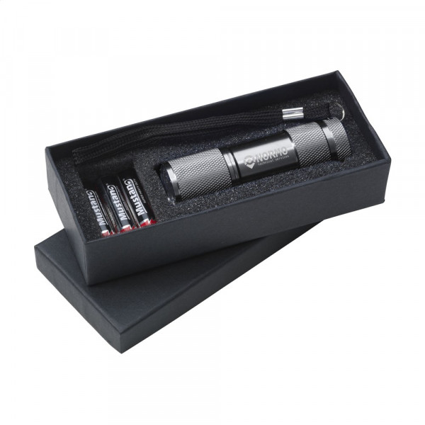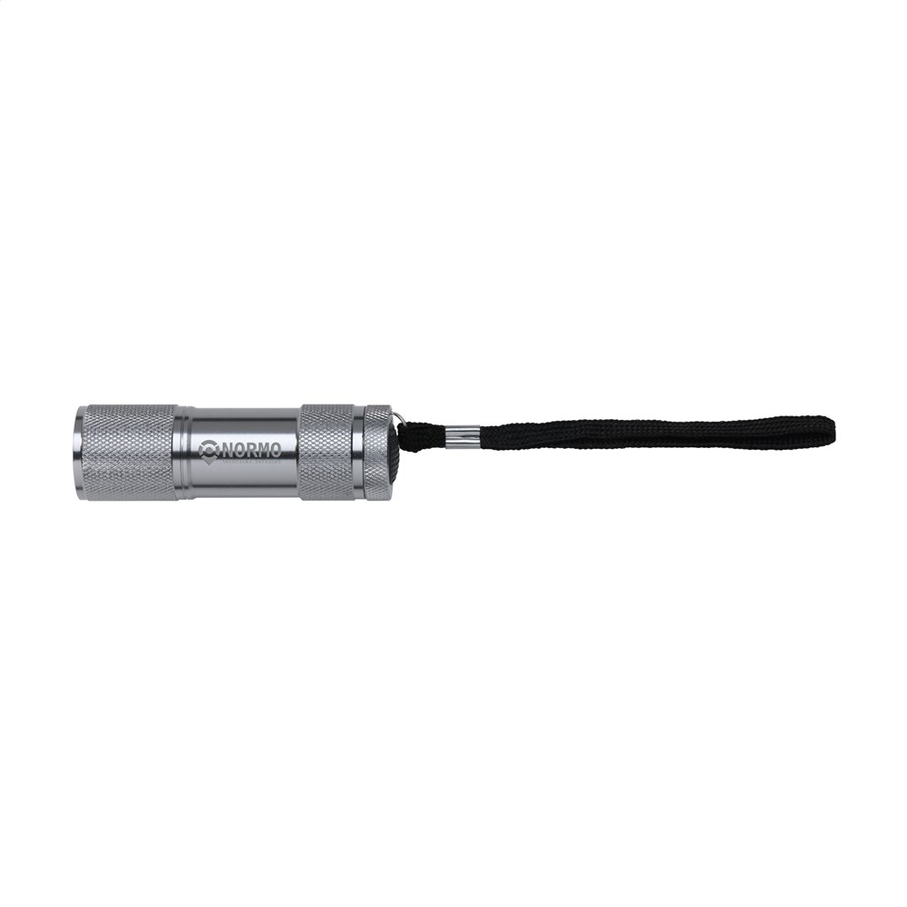 Aluminium-Stablampe mit 9 hellweißen, energiesparenden LED-Lampen und abnehmbarer Schlaufe. Maße: Ø 2,7 x 9 cm. Inkl. Batterien. Verpackt pro Stück.