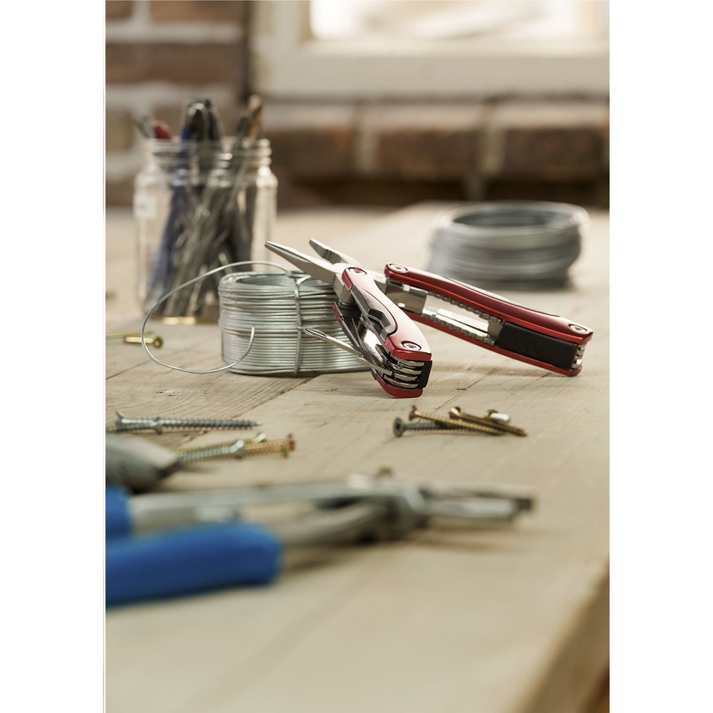 Kompakte Multizange aus Edelstahl mit Handgriff aus Aluminium im Metalliclook. 9-teilig mit 13 Funktionen: Zange, Isolierzange, 3 Schraubenzieher, Reibahle, Feile, Dosenöffner, Kapselheber, Fischentschupper, Haken-Entferner, Messer, Kreuzschraubenzieher. Mit Schloss. In einem Nylonetui. Beachten Sie, dass möglicherweise lokale Vorschriften für den Besitz und / oder das Tragen von Messern oder Multitools in der Öffentlichkeit gelten. Wird einzeln in einem Kraftkarton geliefert.