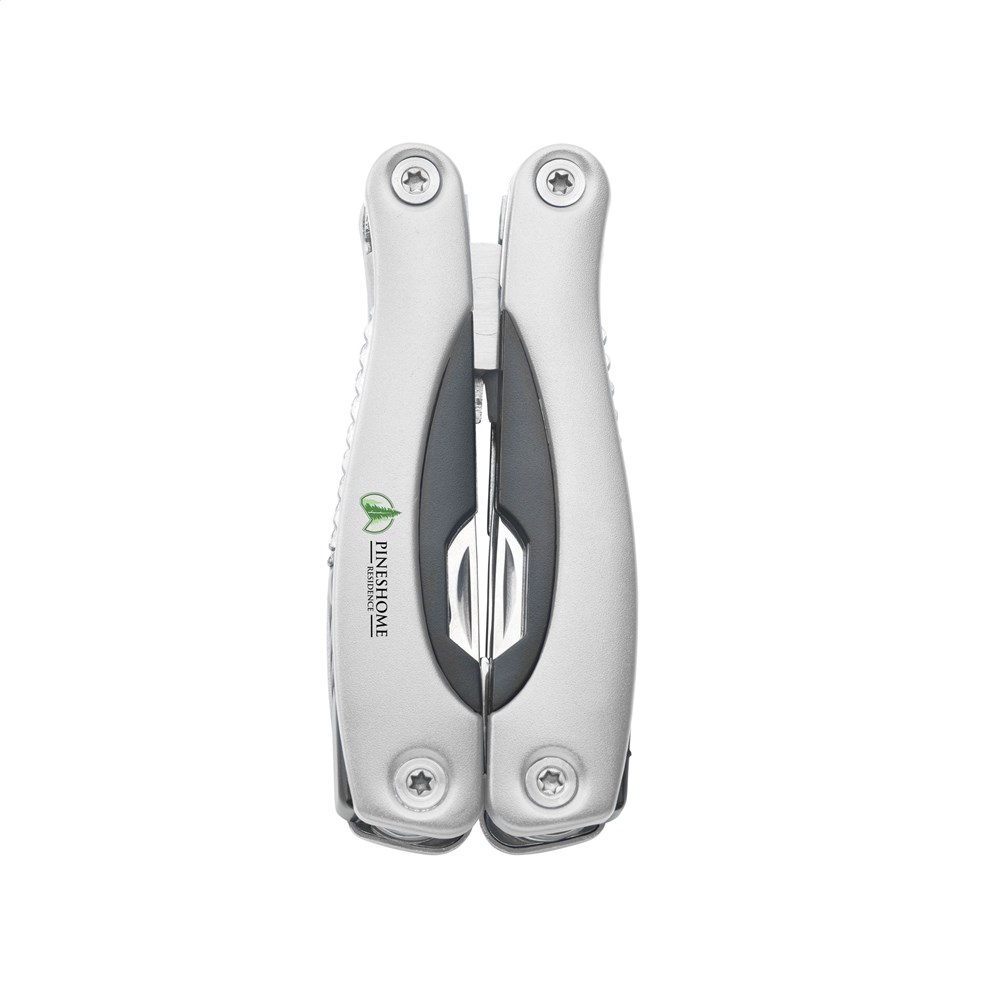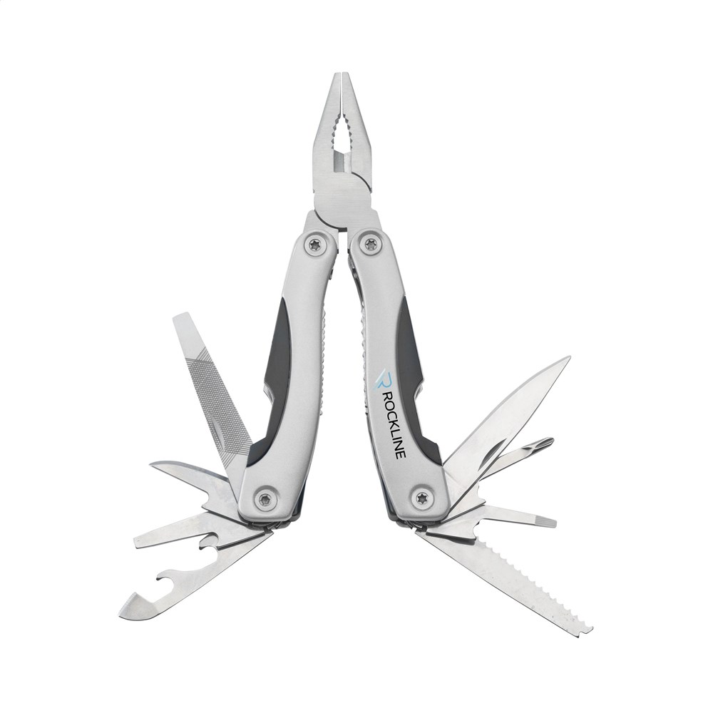Kompakte Multizange aus Edelstahl mit Aluminiumhandgriff in Metallic-Look. 9-teilig mit 13 Funktionen: Zange, Isolierzange, 3 Schraubenzieher, Kreuzschraubenzieher, Feile, Säge/Fischentschupper, Messer, Reibahle, Dosenöffner und Kapselheber. In einem 600D Nylonetui.Beachten Sie, dass möglicherweise lokale Vorschriften für den Besitz und / oder das Tragen von Messern oder Multitools in der Öffentlichkeit gelten. Wird einzeln in einem Kraftkarton geliefert.