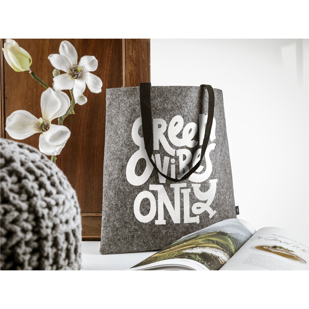 Robuster Shopper aus dickem RPET Qualitätsfilz mit langen, gewebten Baumwollgriffen. GRS-zertifiziert. Gesamtes recyceltes Material: 75%. Fassungsvermögen ca. 11 Liter.