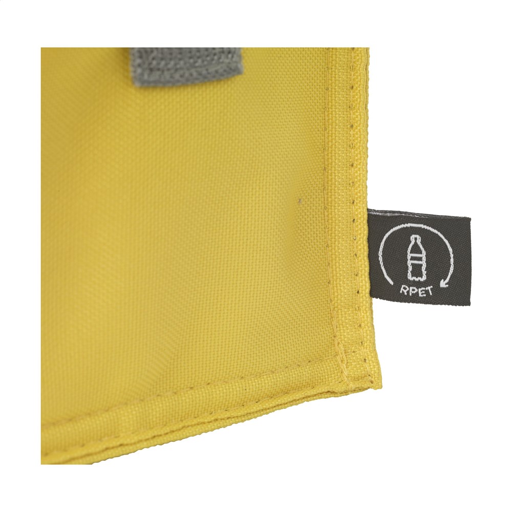 Kühltasche aus 600D-RPET-Polyester-Kühltasche. Geeignet für 6 Getränkedosen. Mit Trageriemen. GRS-zertifiziert. Recyceltes Material insgesamt: 51%. Fassungsvermögen ca. 3 Liter.
