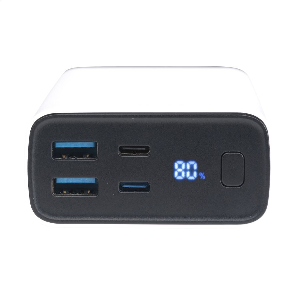 Sehr leistungsstarke Powerbank mit integriertem 20.000-mAh-Lithium-Polymer-Akku. Das Gehäuse besteht zu 100% aus RCS-zertifiziertem recyceltem ABS. Mit Ein-/Aus-Taste und Display mit prozentualer Akkuanzeige. Typ-C-Eingang: DC5V/3A, 9V/2A, 12/1,5A. Typ-C-Ausgang: DC5V/3A, 9V/2,22A, 12/1,67A. USB-A-Ausgang: DC5V/3A, 9V/2A, 12/1,5A. Kabelgebundener Ausgang: 22W. Inklusive rTPE USB-C-zu-USB-C-Ladekabel und Gebrauchsanweisung. Verpackt pro Stück.